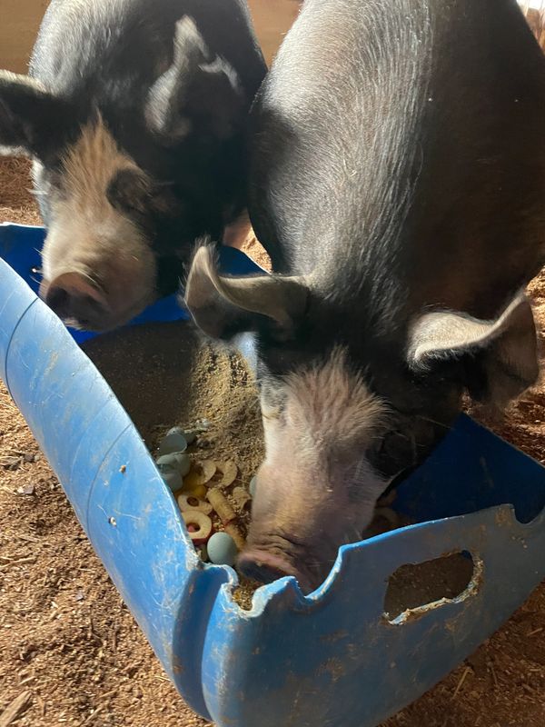 They have full feed 24/7. It’s a hog grower mix with all the nutrients they need, and from a local grain provider. We feed garden scraps. Also, 24/7 access to water nipples.
